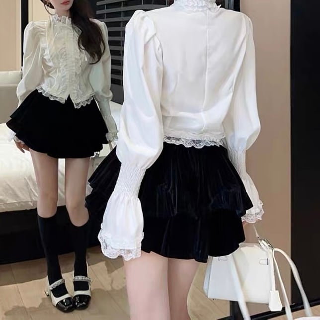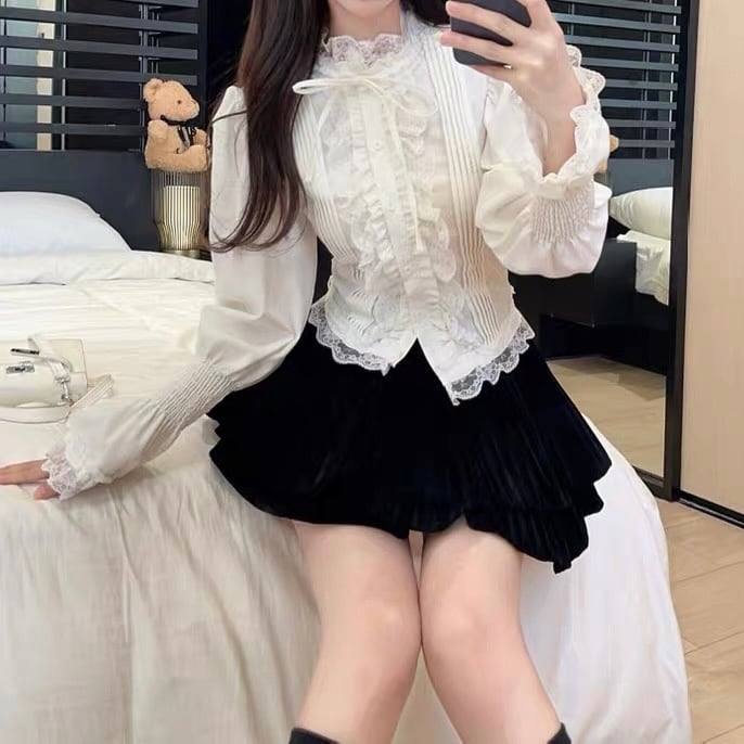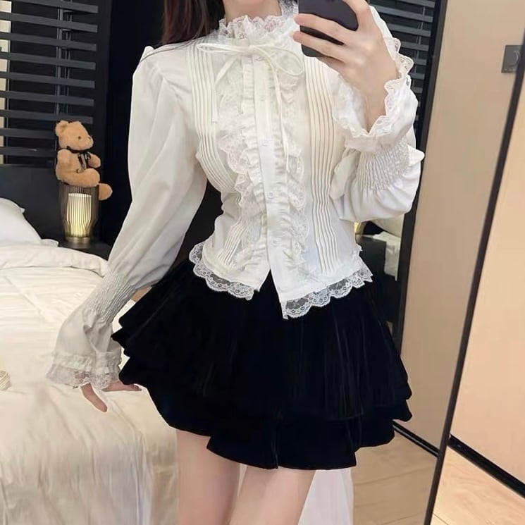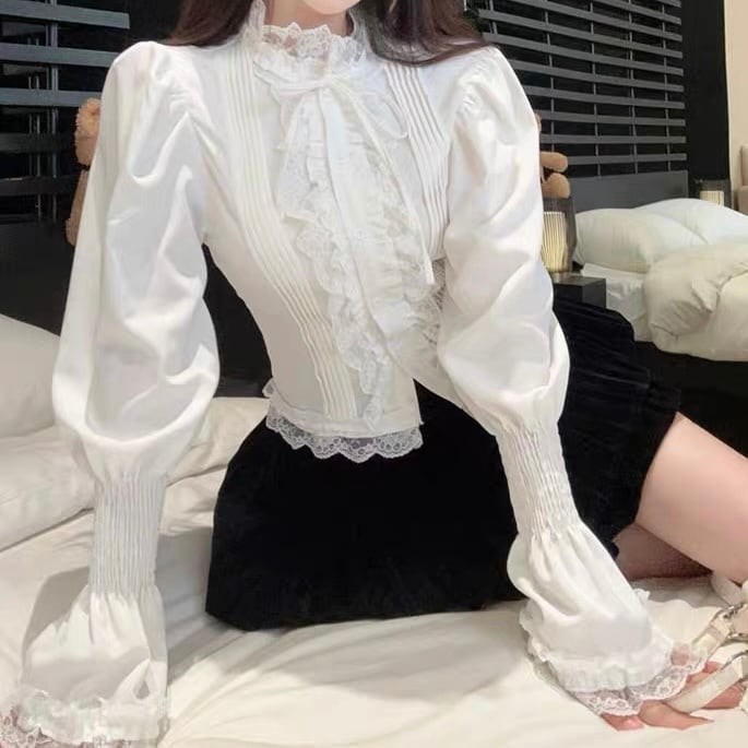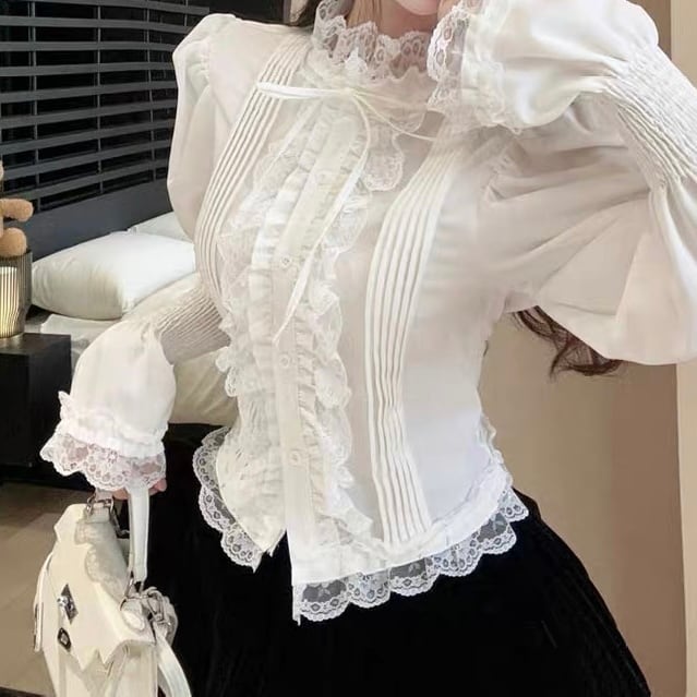 胸元のリボンとフリル、繊細なレースが目を惹くクラシカルブラウス♡