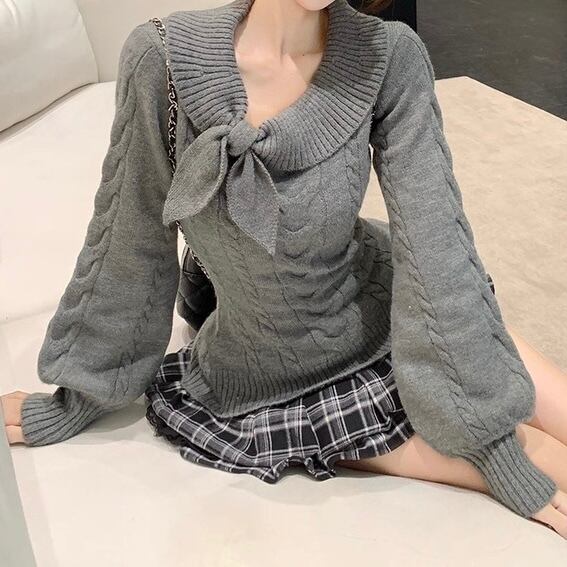 大きめリボンとケーブル編みが可愛いニットトップス♡