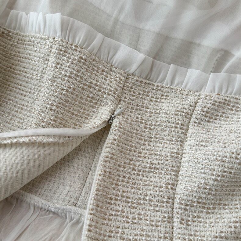 ツイード素材の上質さが魅力で、程よい透け感と首元のリボンデザインがアクセントになっています୨୧