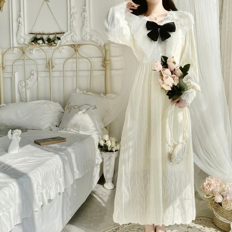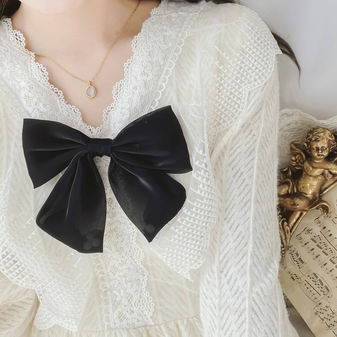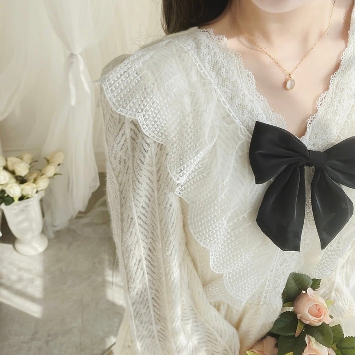華やかなレースの襟が特徴的で、Vネックデザインが女性らしい印象を与えます。