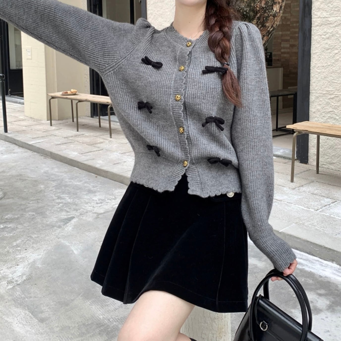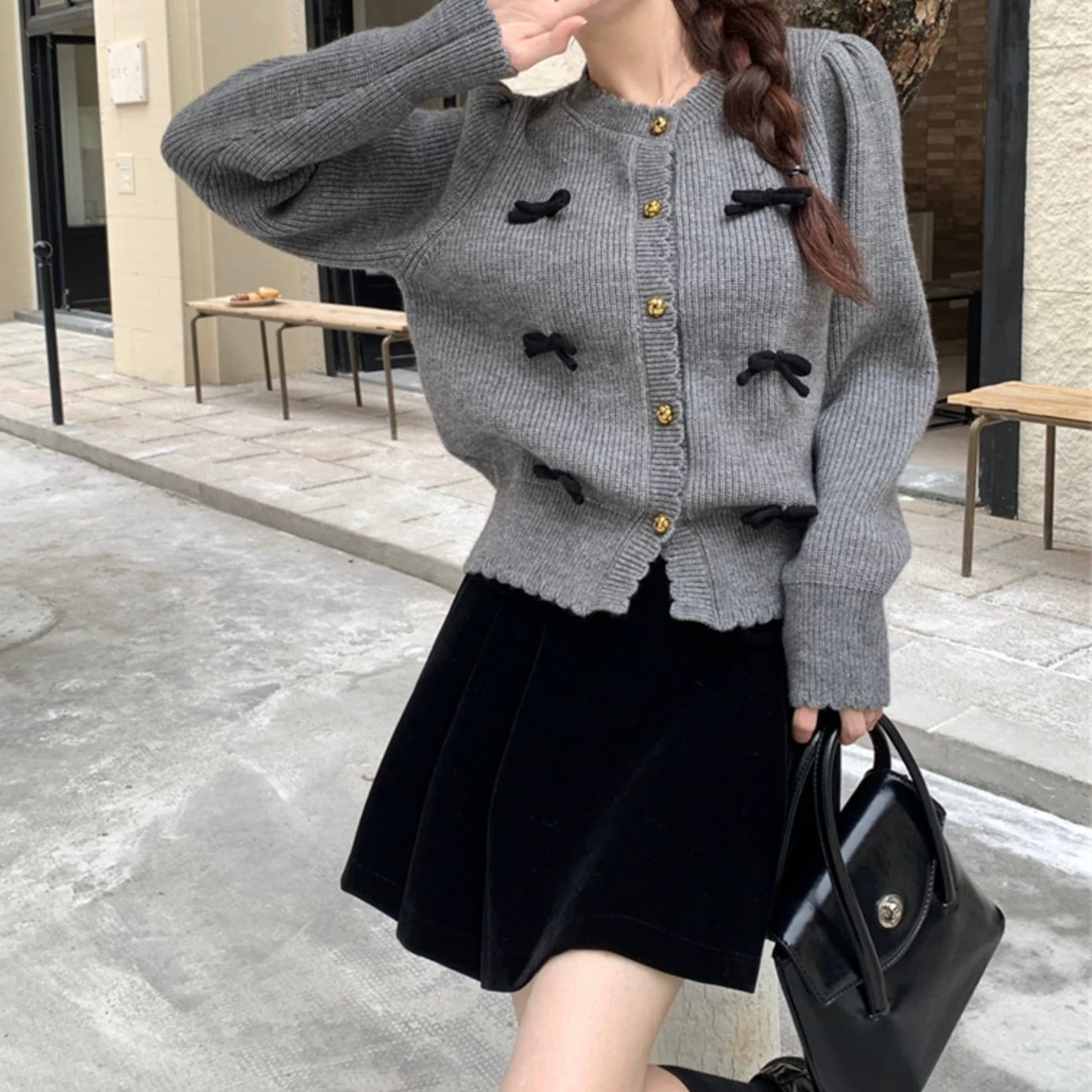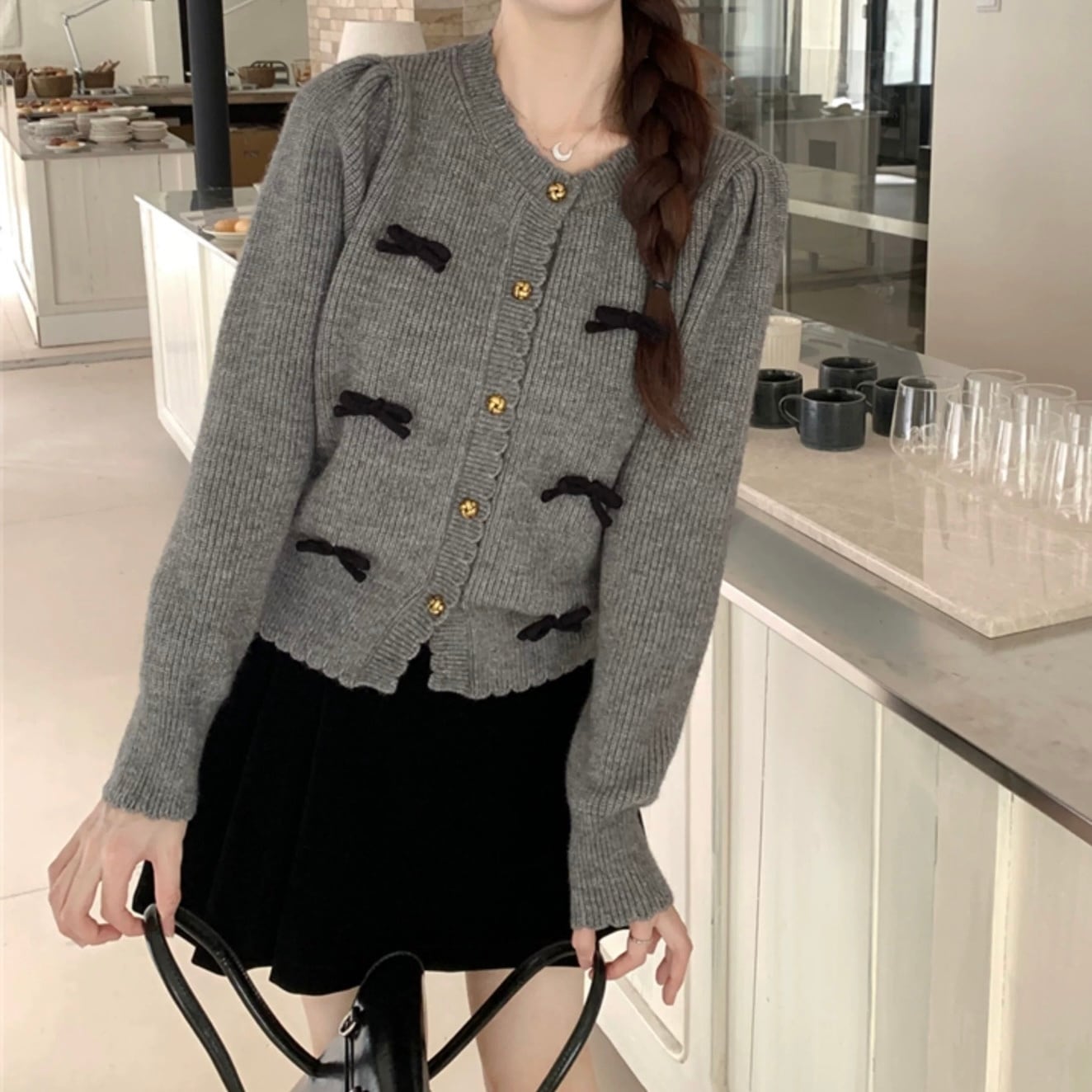 愛らしいトリプルリボンとスカラップデザインが魅力のカーディガンが登場!