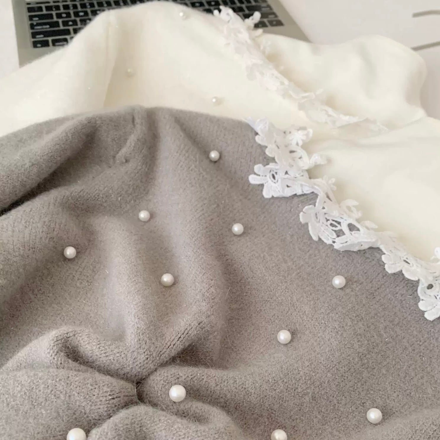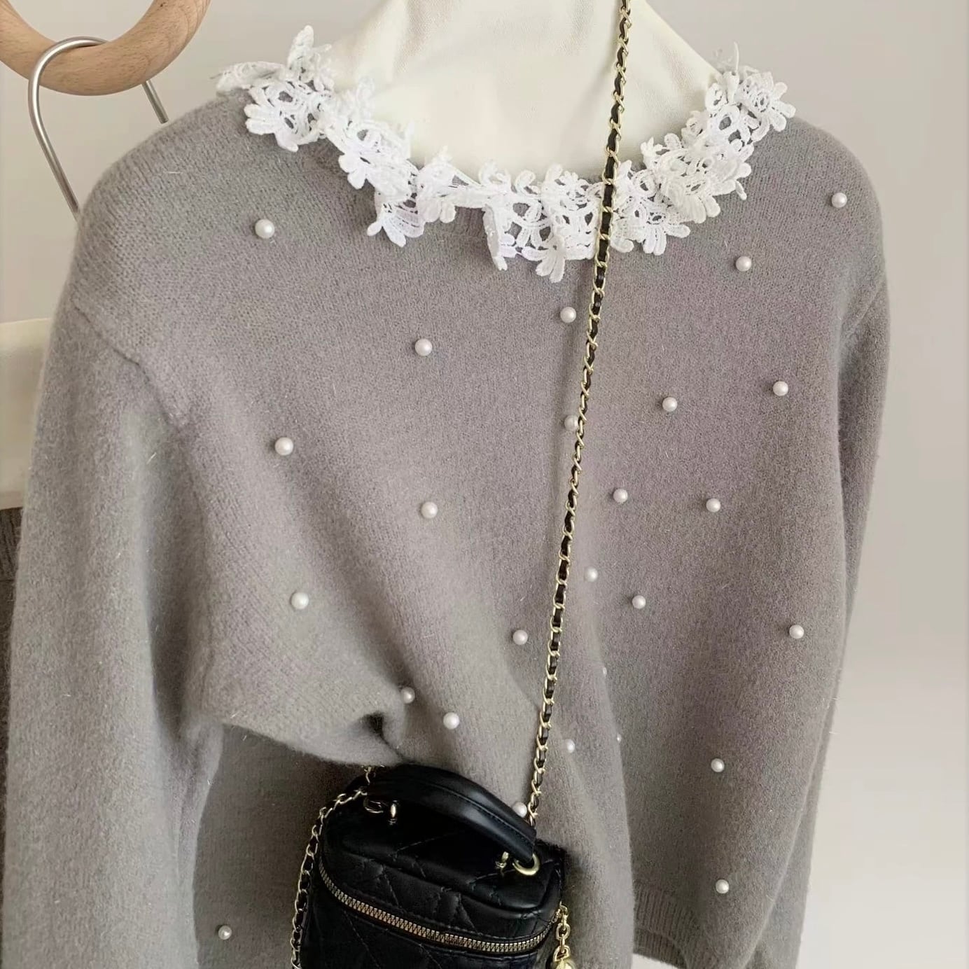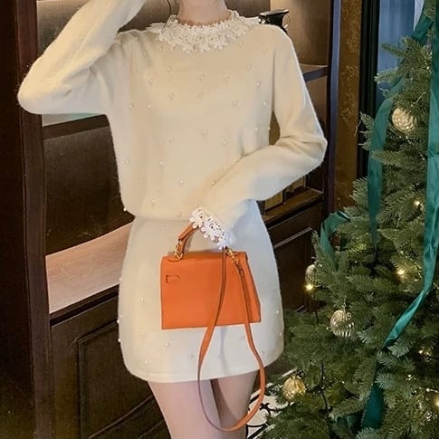 襟元や袖口のポイントレースに繊細なパールのディテールが華やかさを演出します。
