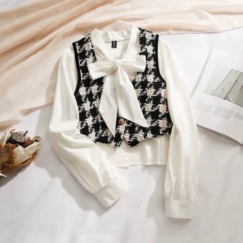チェック柄のベストが、クラシカルでありながらもトレンド感を演出。