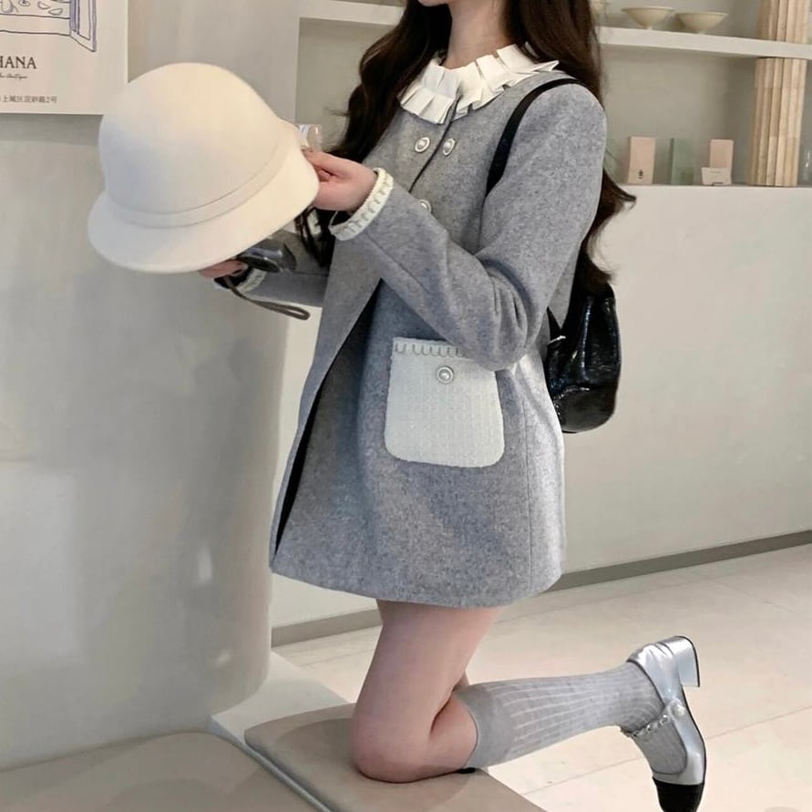 フリルカラーが特徴的で、ダブルボタンのデザインが洗練された印象を与え、様々なスタイリングに対応できる一着です♡