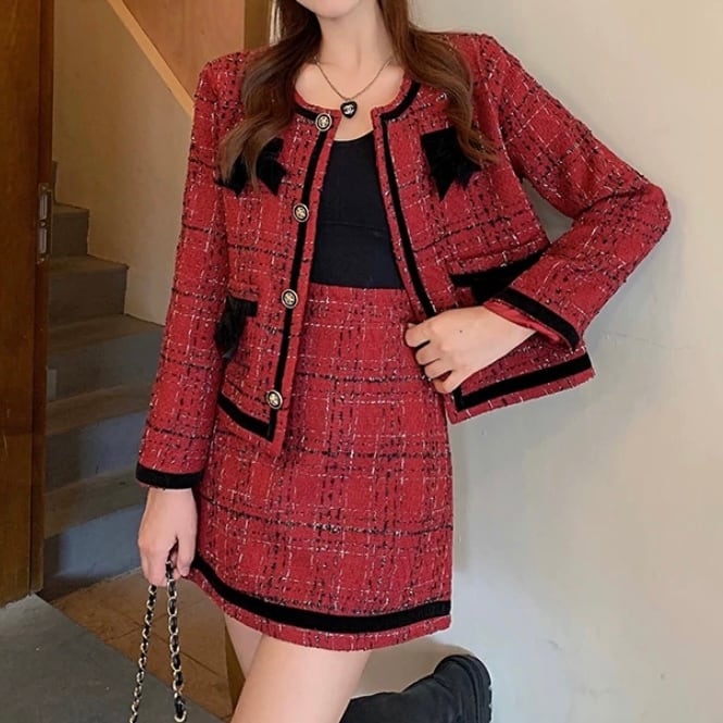 可愛らしさとトレンド感満載のレッドチェックセットアップ。