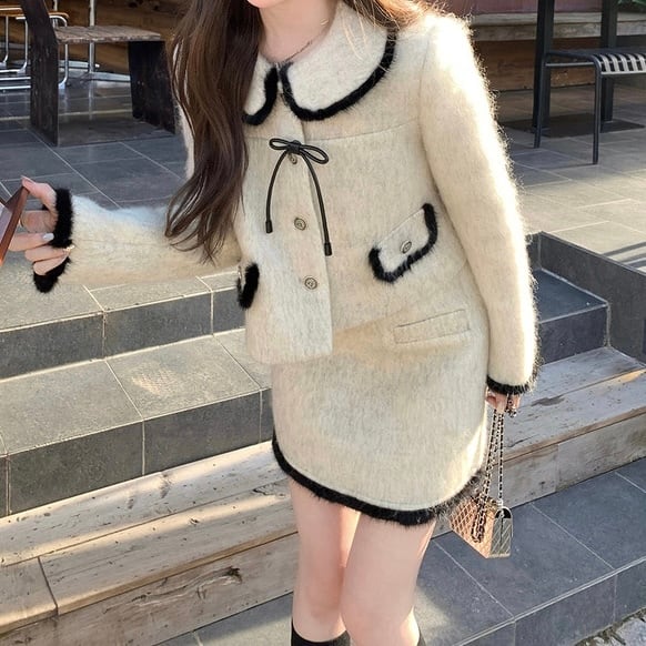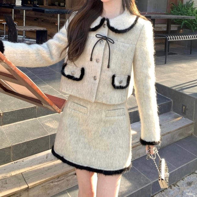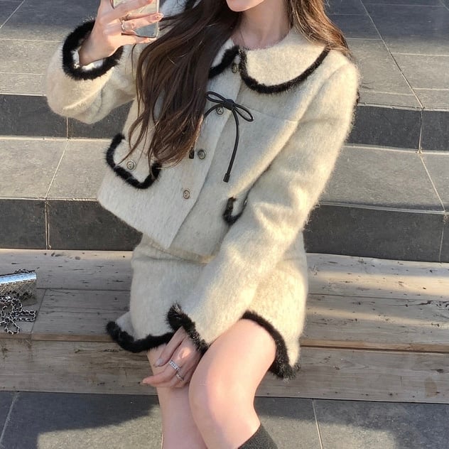 グレーのベースに、襟元、ポケット、裾、袖口にはエレガントな黒色ファーがあしらわれており、細部にまでこだわったデザインが魅力です⸜❤︎⸝
