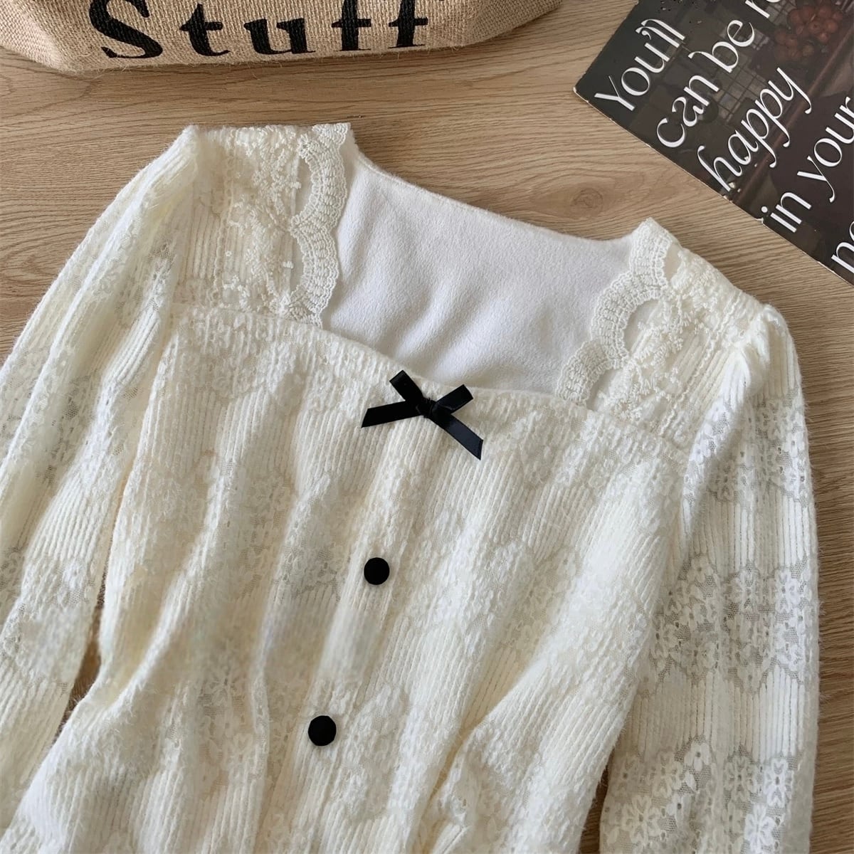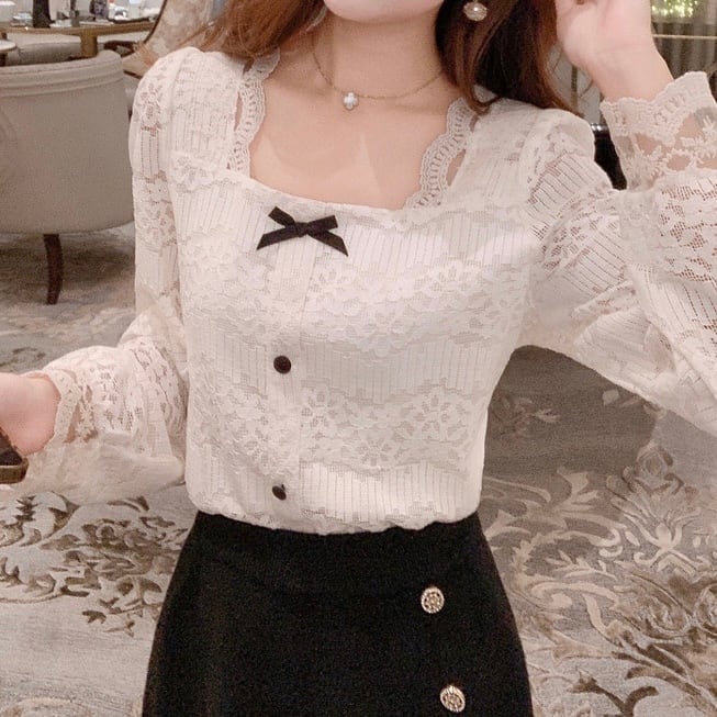 可愛らしさと華やかさを兼ね備えたレースショルダースクエアトップス。