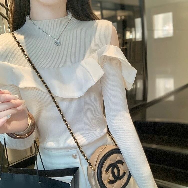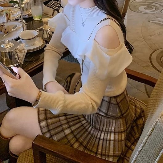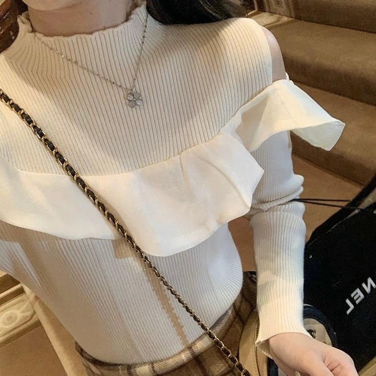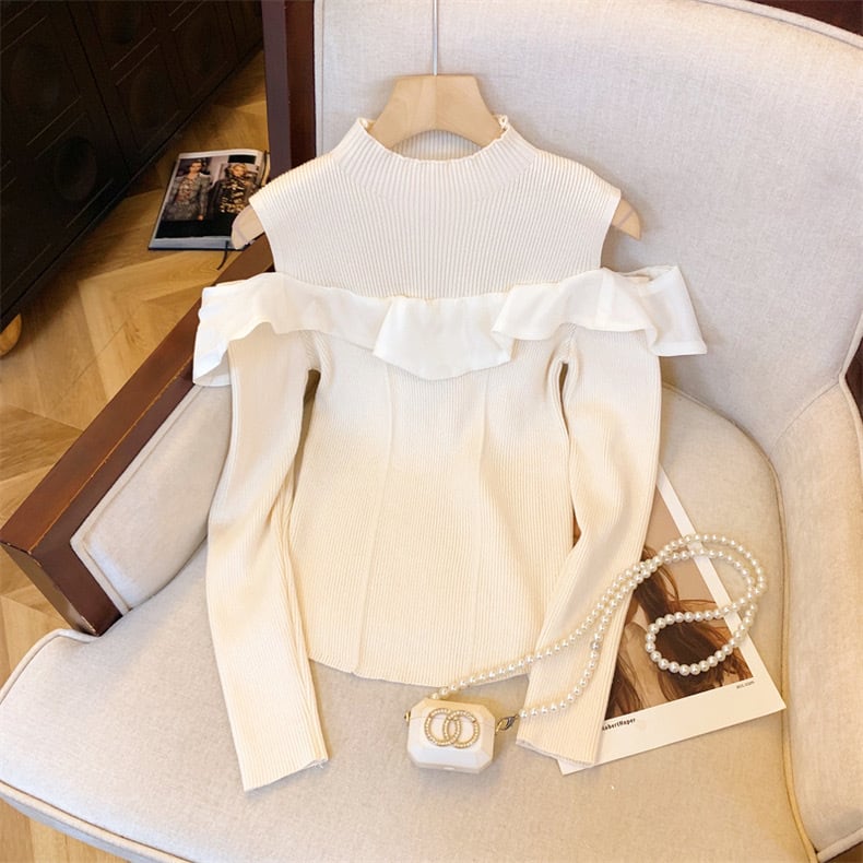 可愛らしさとトレンド感を兼ね備えたオープンショルダーフリルトップス。