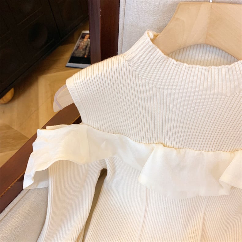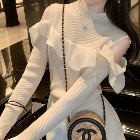 オープンショルダーのデザインで抜け感を演出し、フリルで華やかさをプラス♪
