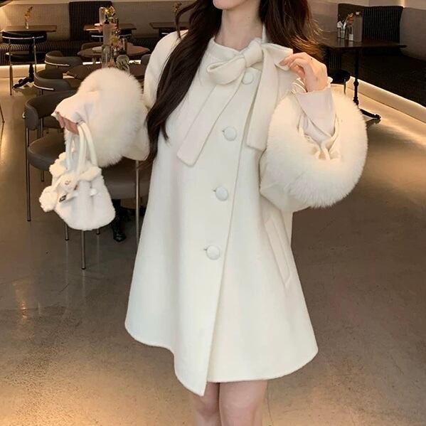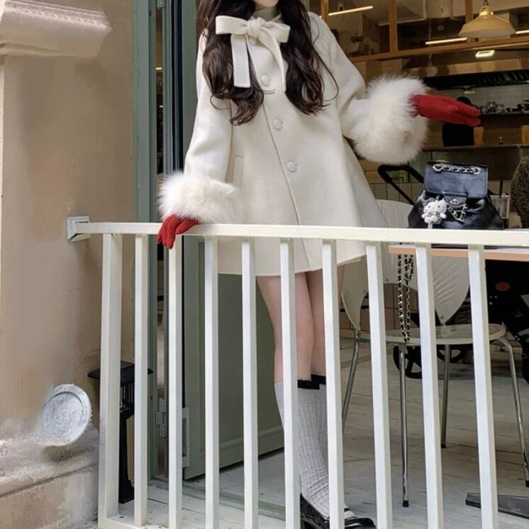 可愛らしさと温かさを感じるリボンネックくるみファーコート♡