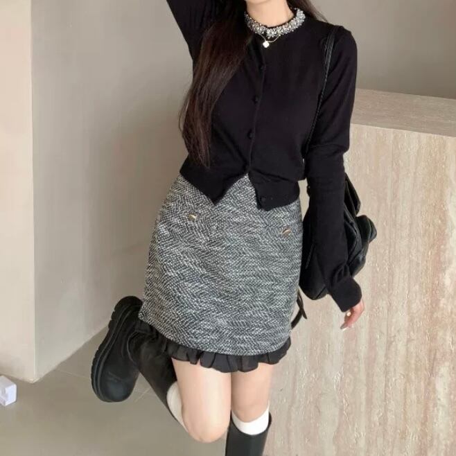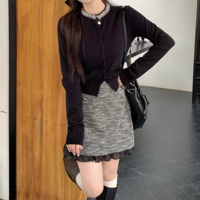 可愛らしさと上品さを感じるブラックレースツイードスカート。