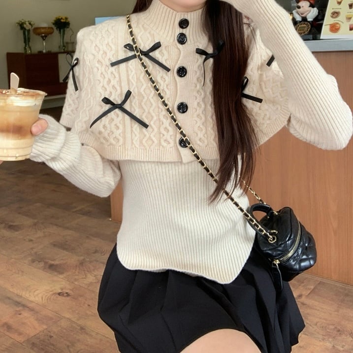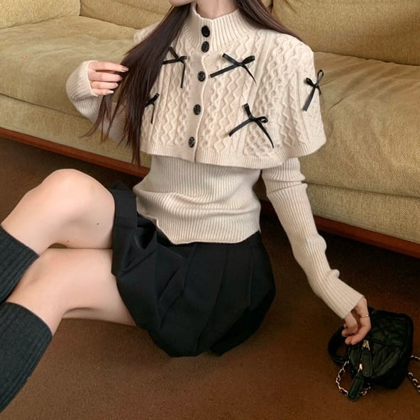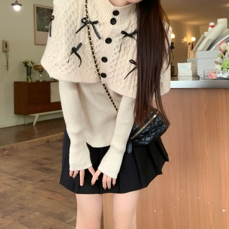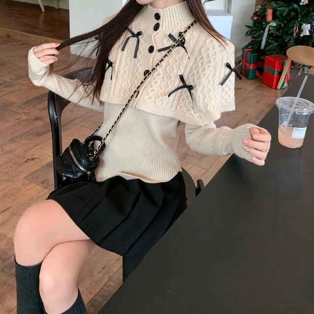 可愛らしさとおしゃれを両立させるリボンケープニットトップスセット。