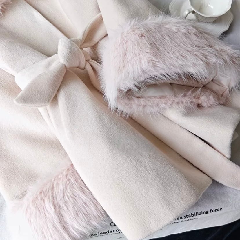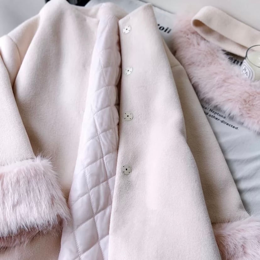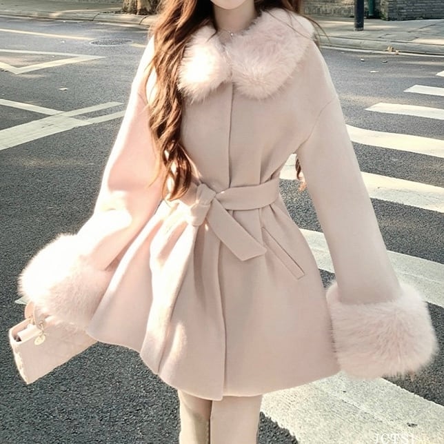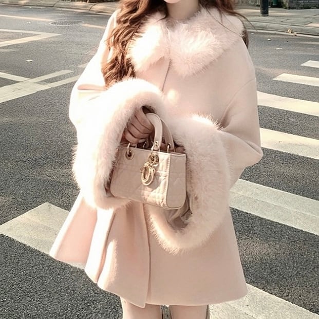 可愛らしさと高級感を兼ね備えたマシュマロピンクファーコート。